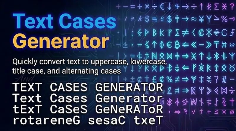 Text Cases is a sub page of this website, here you will find common used text tools like, UPPERCASE (HELLO WORLD), lowercase (hello world), Title Case (Hello World), Sentence case (Hello world), Capitalize Each Word, aLtErNaTiNg cAsE, iNVERT cASE, Small Caps (สแดสสแด แดกแดสสแด ), Bold Text (๐๐๐ฅ๐ฅ๐จ), Italic Text (๐๐ฆ๐ญ๐ญ๐ฐ), these you will see here. Sometimes you know, we need to change how our text looks. Maybe we want it in uppercase, lowercase, or a proper title format. Doing this manually can take time and effort.